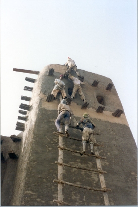 de la façade Nord Il faut être bon maçon, sûr de soi et de ses pouvoirs pour monter tout en haut des échelles, puis plus haut encore en escaladant les "torons" ; et il faudra encore arrimer l'échelle, faire monter les paniers, les attraper sans lâcher ni renverser, et faire du bon travail ! |