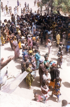 de la mosquée Les jeunes filles sont chargées d'approvisionner le chantier en eau. Les tas de "banco", préparés depuis plusieurs jours (au moins une dizaine) et laissés à pourrir sur place, doivent être au dernier moment mouillés et foulés pour que la matière à crépir soit bien gluante, homogène et assez liquide. |
