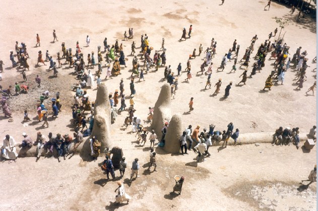 Depuis le toit de la mosquée, on voir arriver un groupe de jeunes filles chargées de seaux d'eau, en courant, au son des sifflets, sous la conduite de cheftaines désignées pour ce jour.